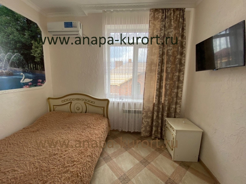 В номере душ с сан узлом,шкаф,двухместная кровать,кресло-кровать,тумбочки,посуда,стол со стульями,холодильник,телевизор, вай-фай,сплит система.Также имеются номера с балконами с видом на море.На этаже полностью оборудованная кухня со всеми необходимыми принадлежностями для самостоятельного приготовления пищи, стиральная машина ,сушилка для белья и гладильный стол с утюгом.При заселении бесплатно выдаются - постельное бельё,полотенца,тапочки,мыло,гель для душа, шампунь.Во дворе бесплатно предоставляется мангальная зона с беседкой и бассейн с лежаками и качелями.На всей территории отеля ведётся видеонаблюдение,на пред домовой зоне предоставляется бесплатно парковка автомобиля.Расстояние до моря 150 метров.В шаговой доступности - детские площадки, рынки,продуктовые и хозяйственные магазины,кафе,аптеки,общественный транспорт,Крещенский парк и Парк Ореховая роща.В нашем райском уголке Вы проведёте незабываемый комфортный отдых на побережье Анапы.Цены: