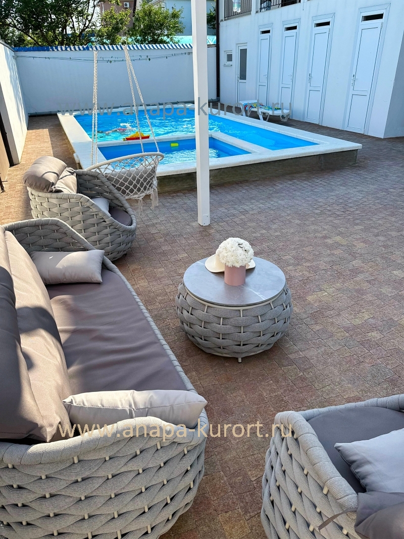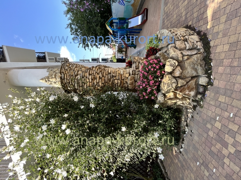 Вас ждет прекрасный уютный двор с южной растительностью, цветами и даже небольшим водопадом. В тени виноградника Вы сможете отдохнуть на летней веранде. На территории гостевого дома есть бассейн с детской зоной. Для детей есть хорошо оборудованная безопасная детская площадка. А вечером в зоне барбекю можно организовать вечерние посиделки с шашлыками.